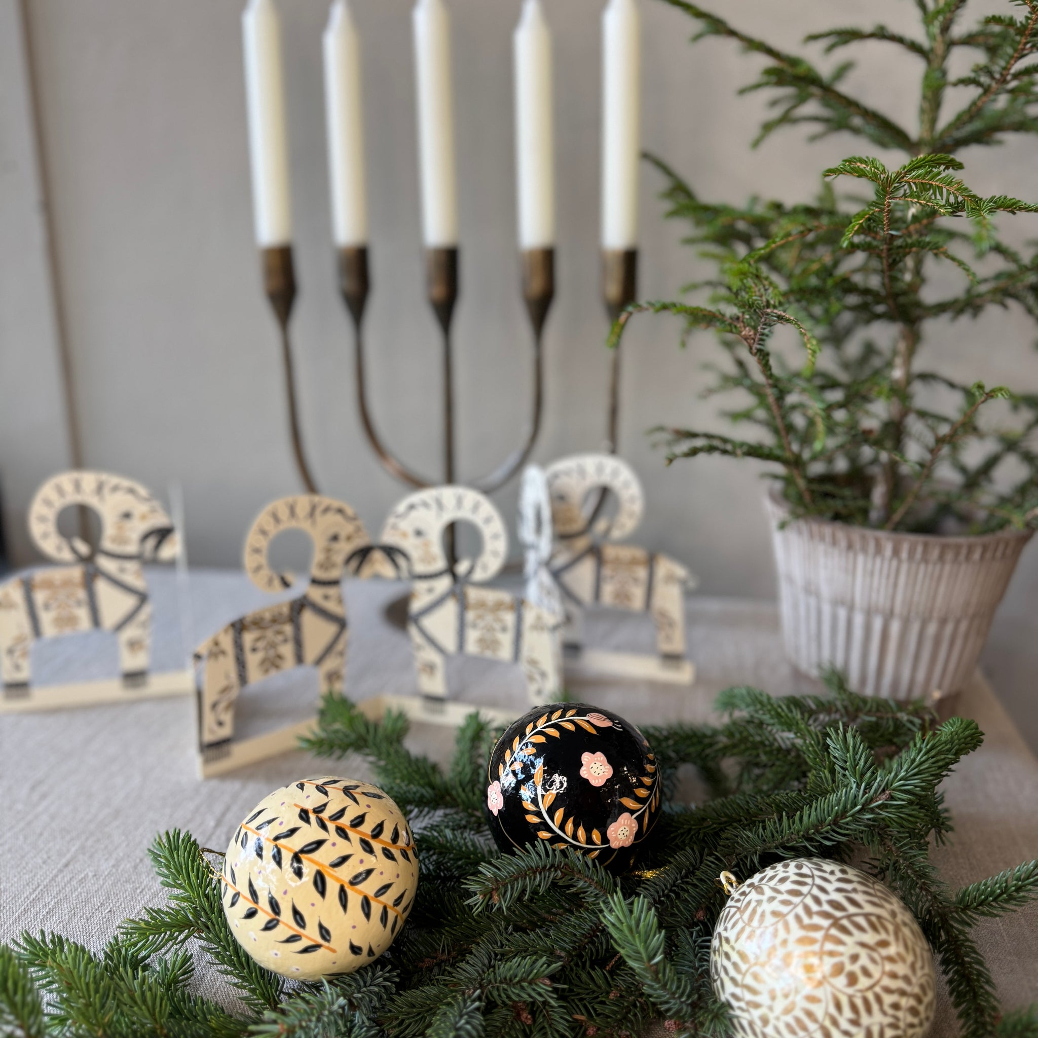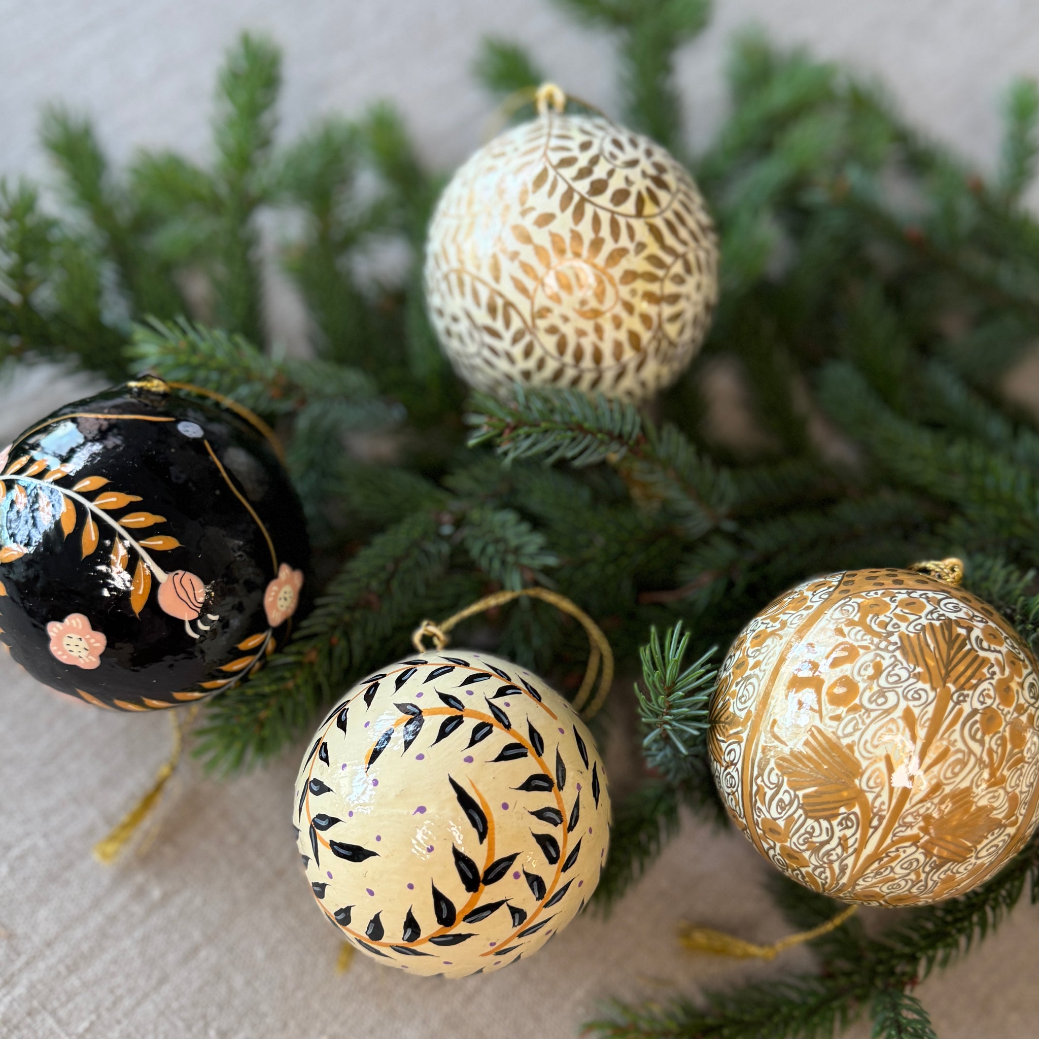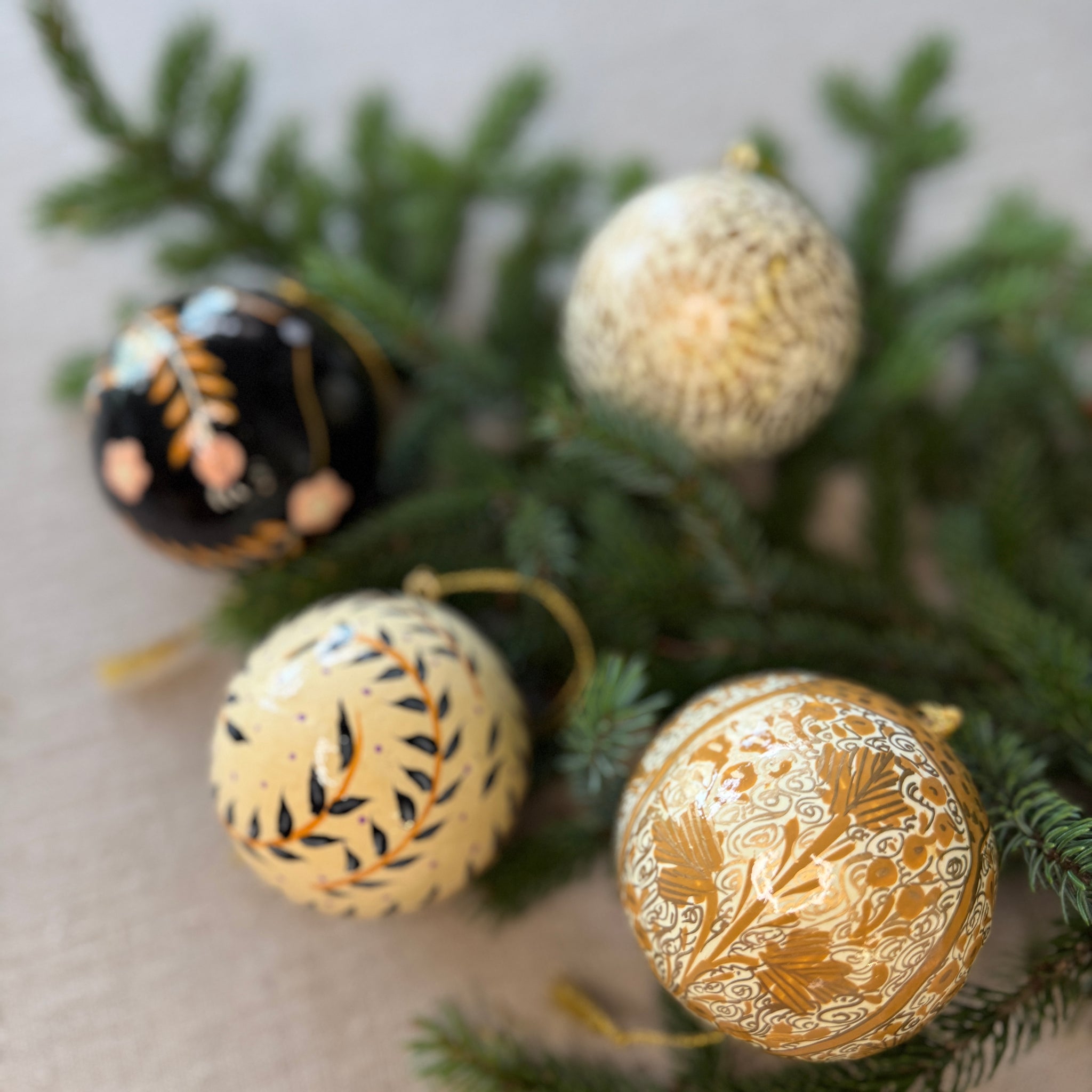 Käsinmaalatut, upeat joulupallot on valmistettu paperimassasta. Tyylikäs mustan ja kullan sävyisten joulupallojen lajitelma. Nämä ovat niin kauniita, että sopivat koristeeksi muutenkin kuin jouluna. Pakattu rasiaan, missä on hyvä säilyttää pallot siistinä.