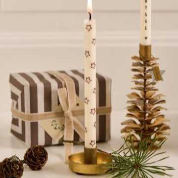Söpö, pieni kynttilänjalka messinginvärisenä kapealle kynttilälle (kynttilän halkaisija 1.3 cm). Halkaisija 5 cm, korkeus 2.5...