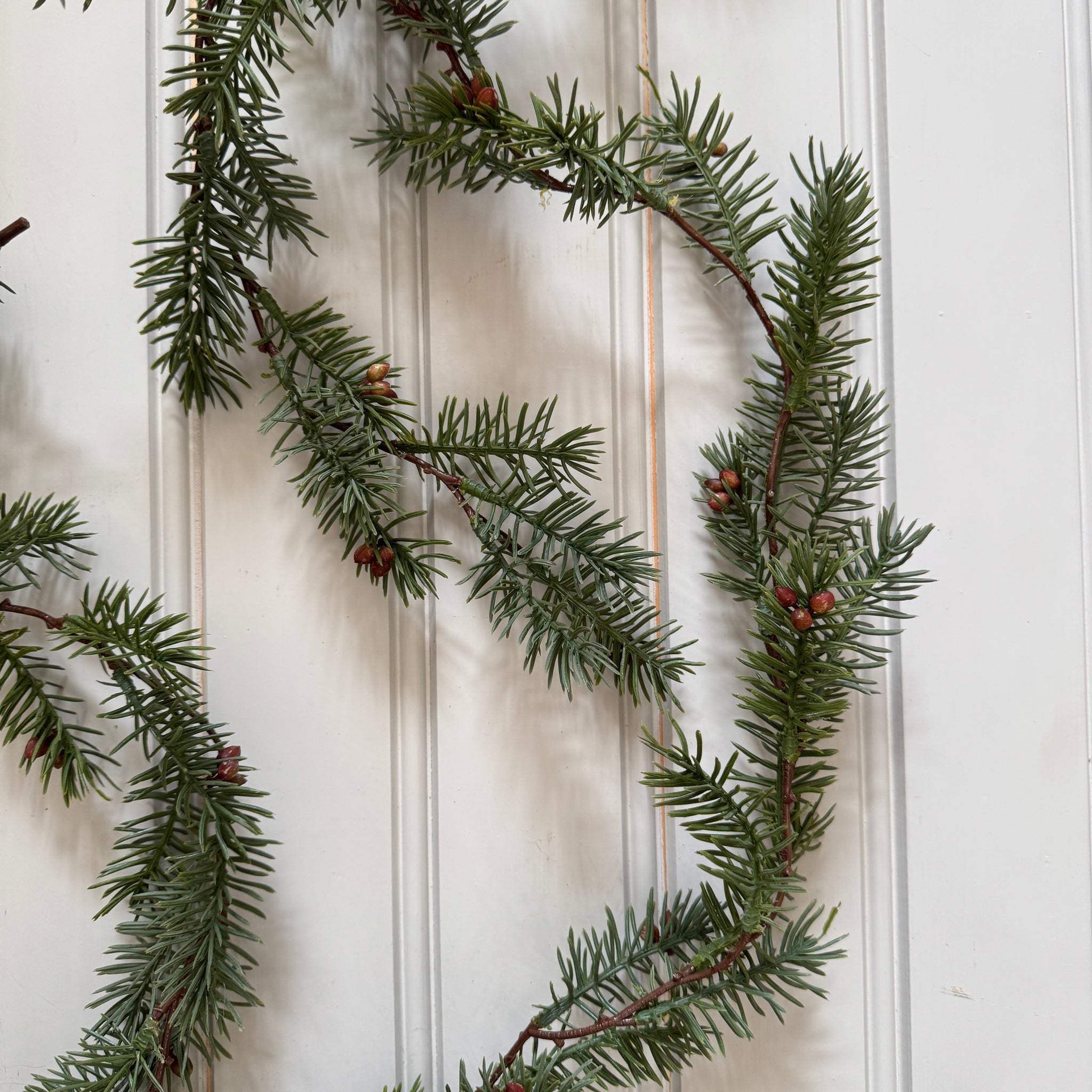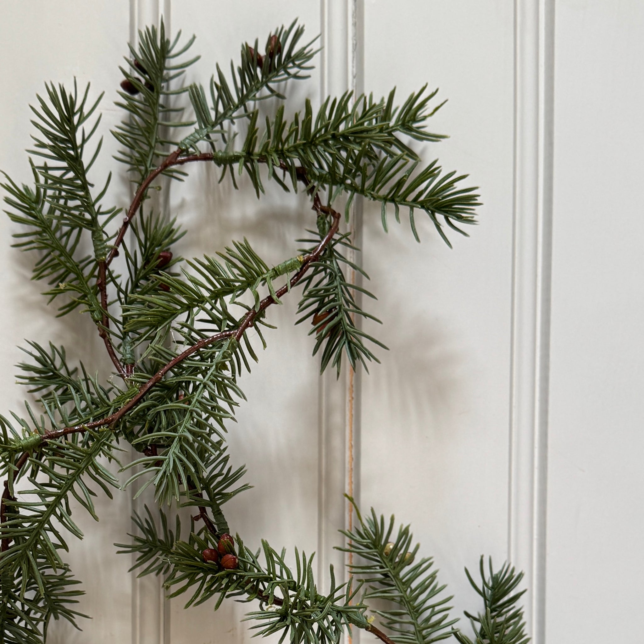 Kaunis ja kovin aidon oloinen, tuuhea kuusiköynnös, jossa on söpöjä käpyjä. Koristele pienillä joulukoristeilla.
