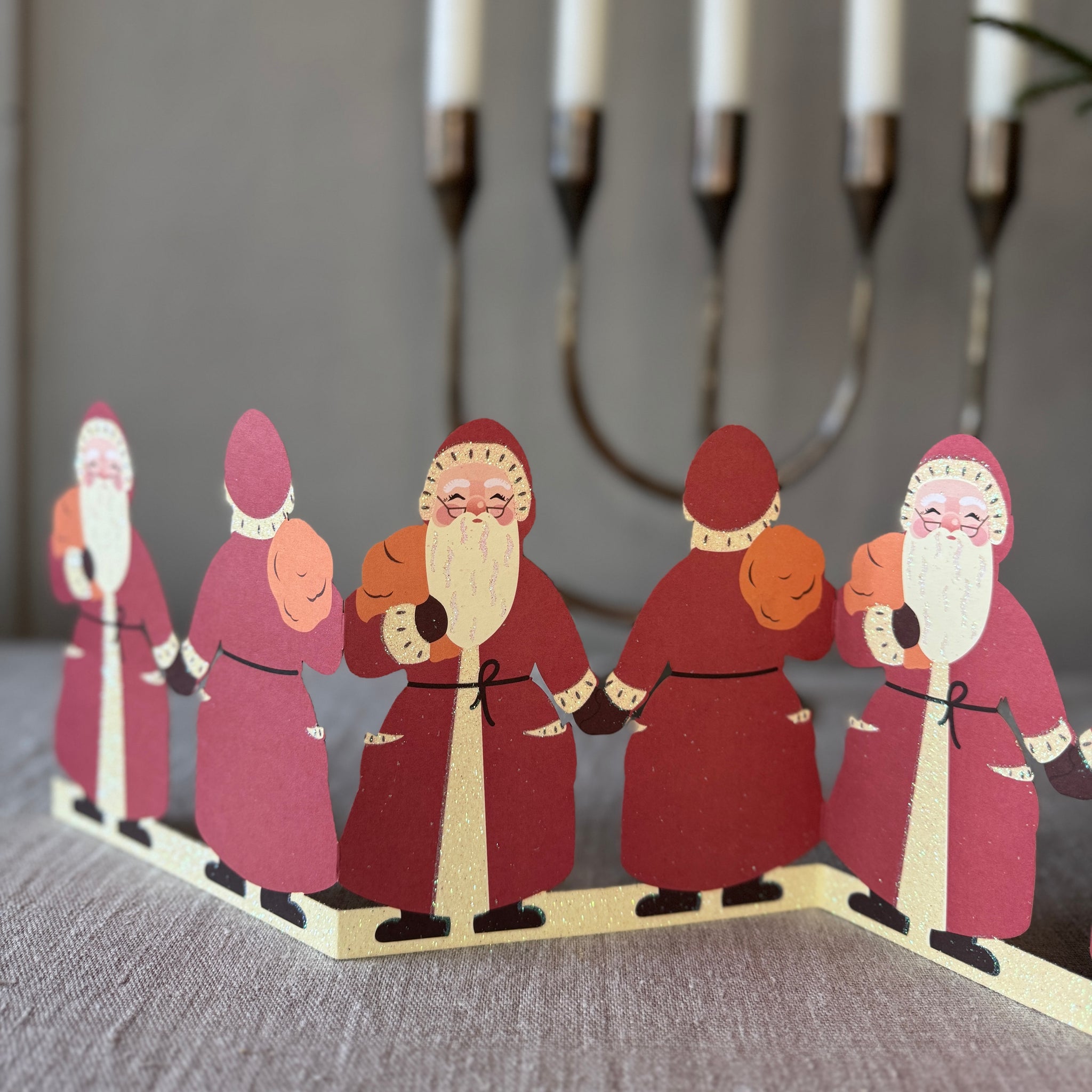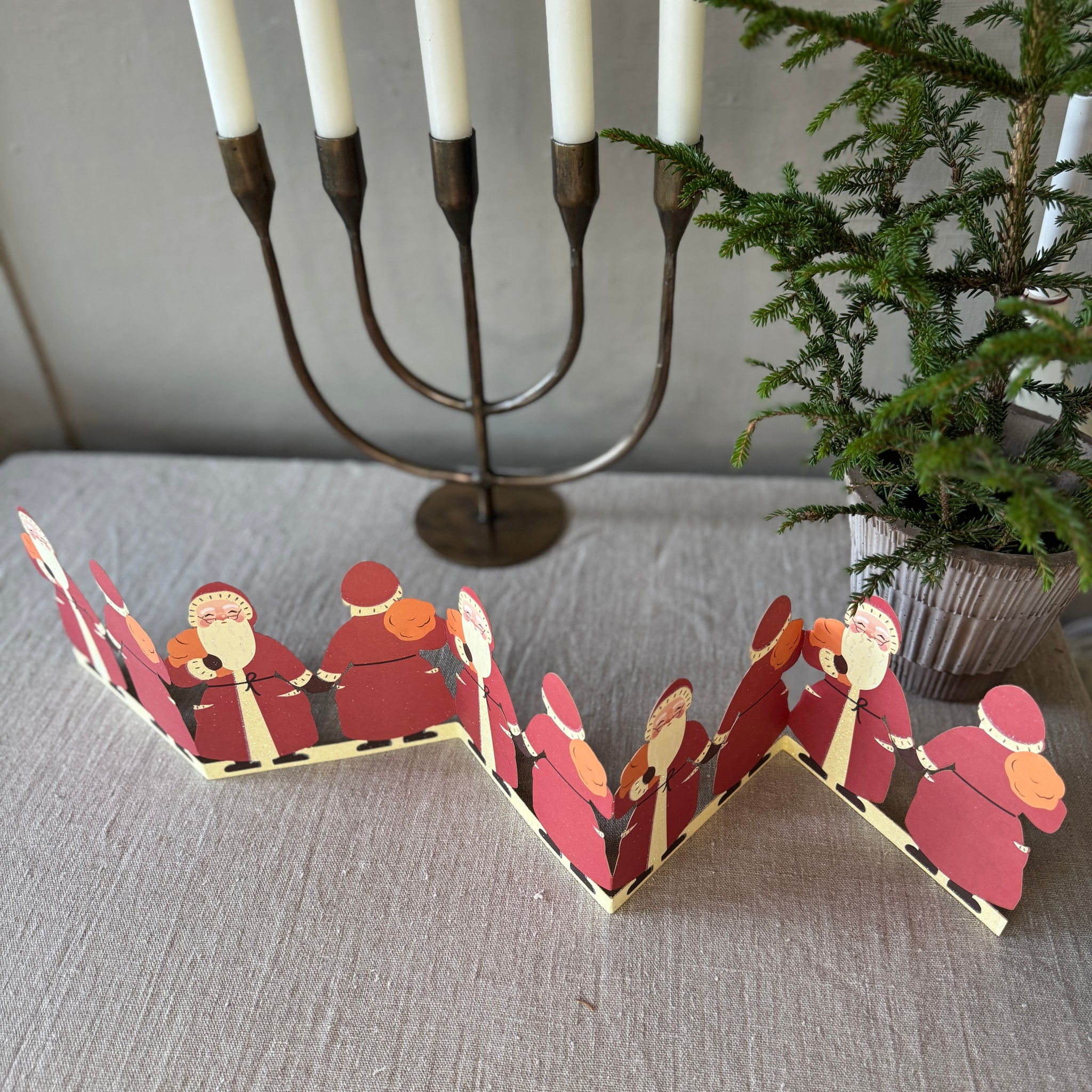 Hurmaava koristenauha joulupukkien rivistöllä. Nämä paperikoristeet ovat niin kauniita koristeita.