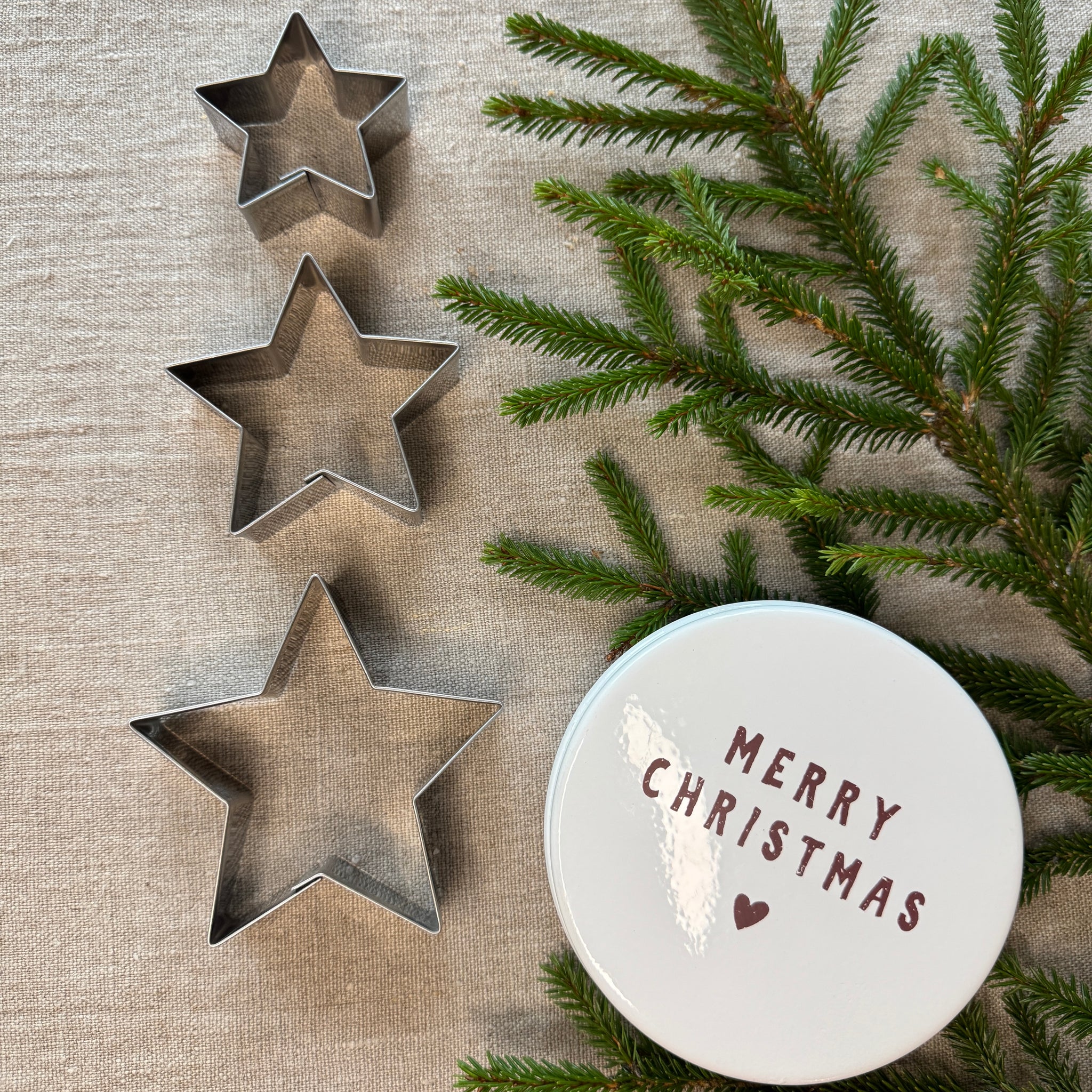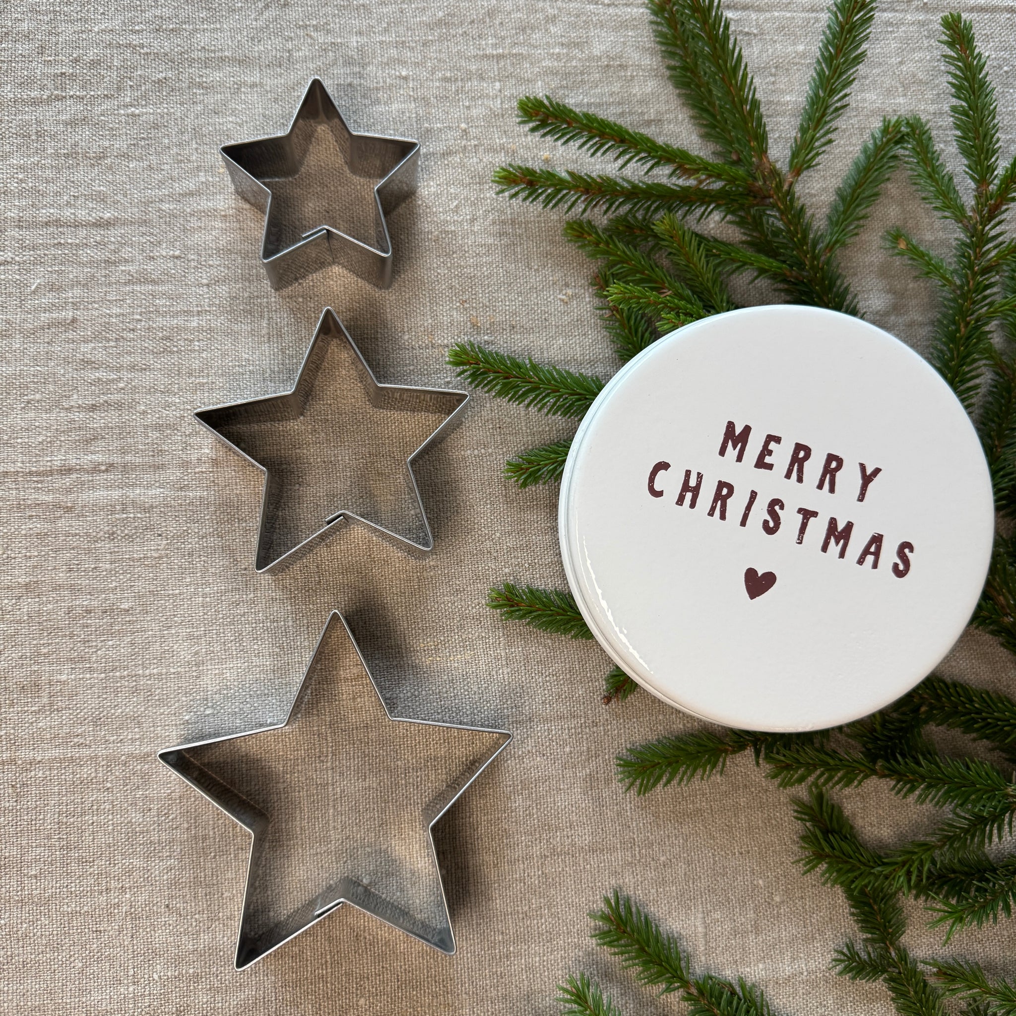 Mainio emaloitu pyöreä rasia Merry Christmas - tekstillä. Sisältää kolme erikokoista tähtimuottia. Kiva lahja leipurille.