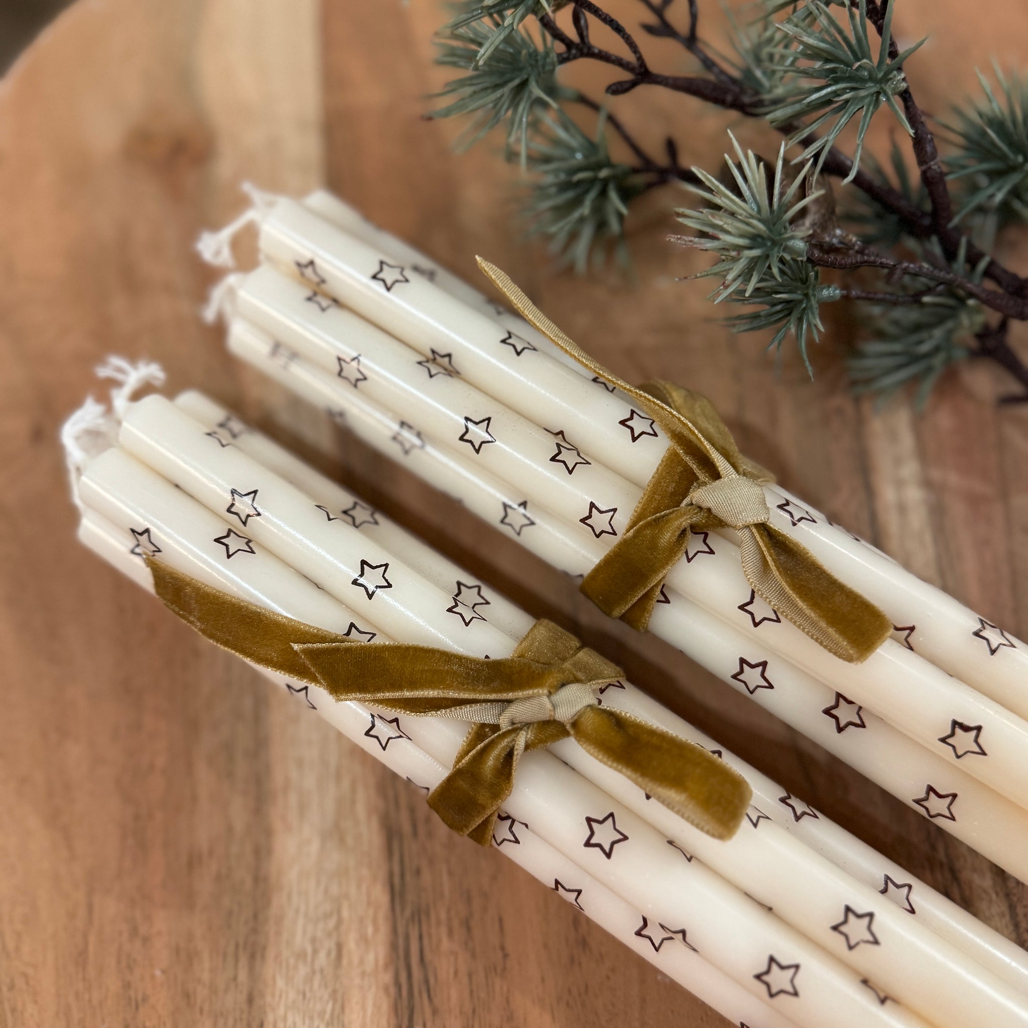 Kapeat, suloiset kynttilät tähtikuvioin. Nipussa 7 kpl. Halkaisija 1.3 cm, pituus 20 cm.