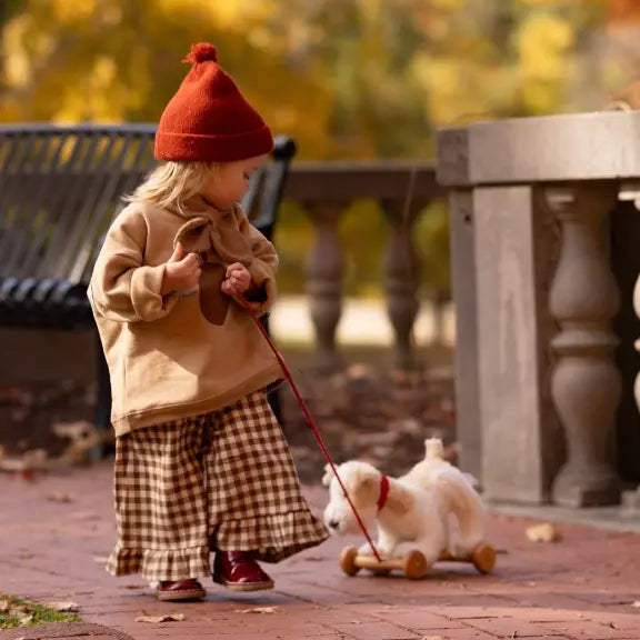 Eliot-koira tulee pienillä puisilla pyörillään!
