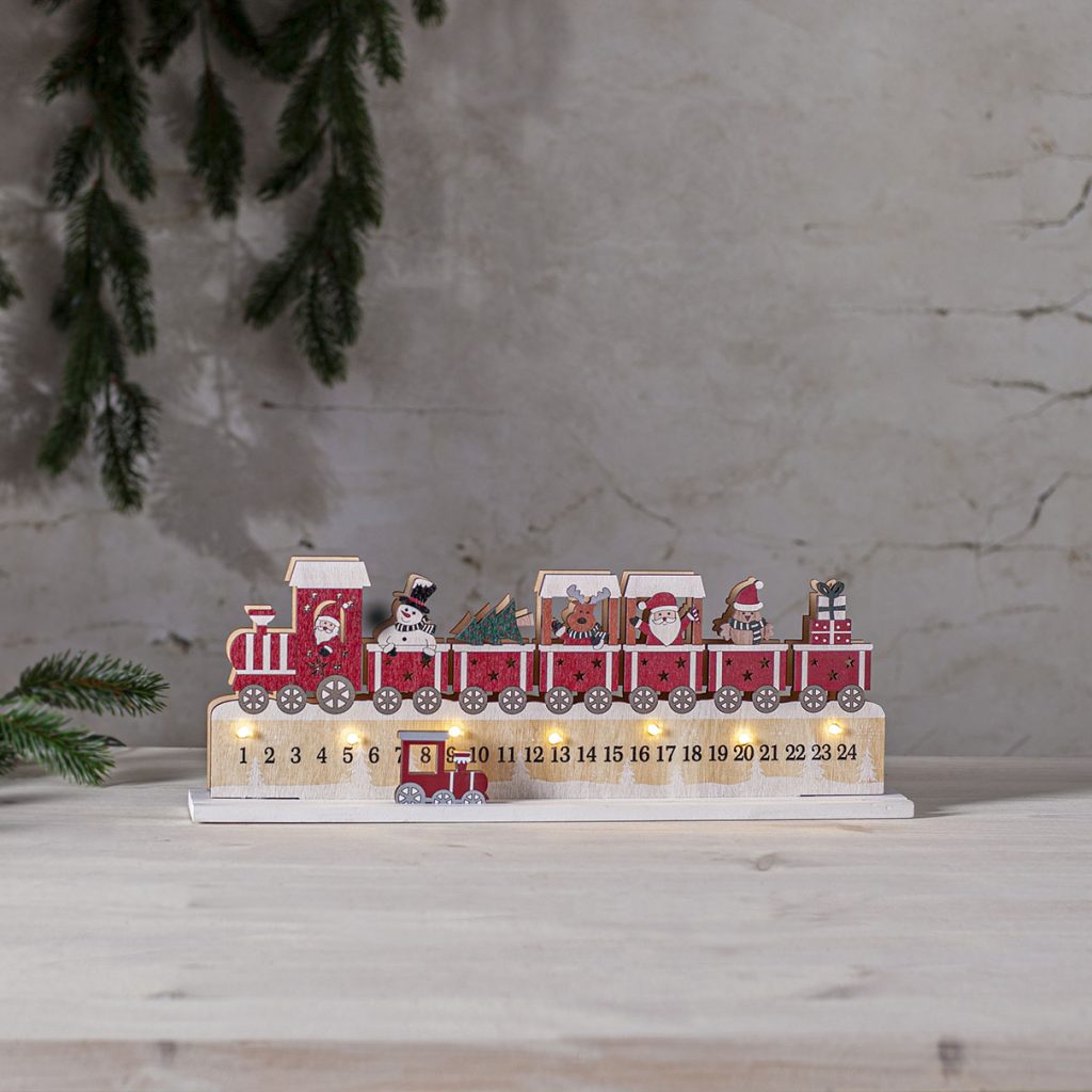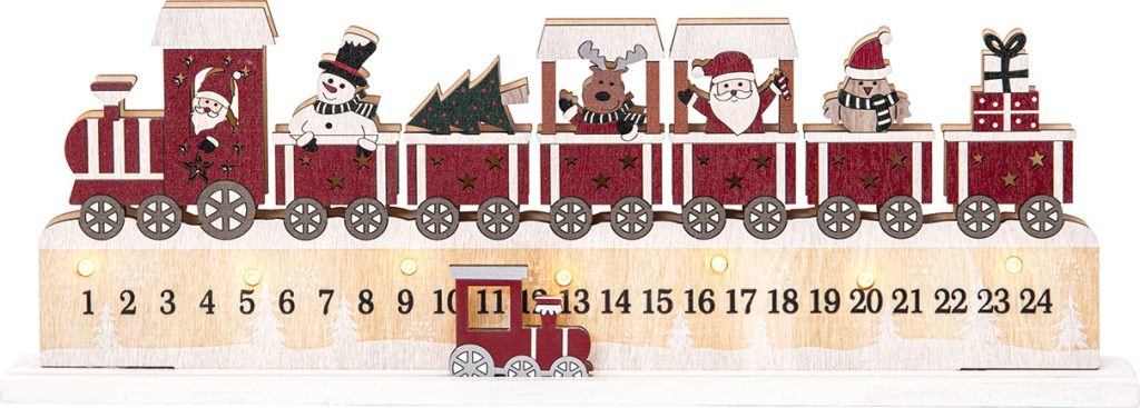 Puinen joulukalenteri, jossa joulujunan kyydissä on iloisia matkustajia. Laske päiviä jouluaattoon liikuttamalla pientä veturia alalaidassa. Kauniin jouluisin sävyin maalattu joulukalenteri on mukava ottaa esille aina joulun lähestyessä.