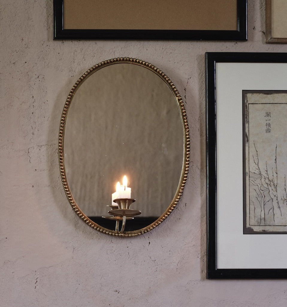 Niin suloinen uutuusmalli - soikea peililampetti kruunukynttilälle. Matta-messinginväriset koristeelliset reunat, kaunis muoto ja kruunukynttilälle sopiva kynttiläpidike.
