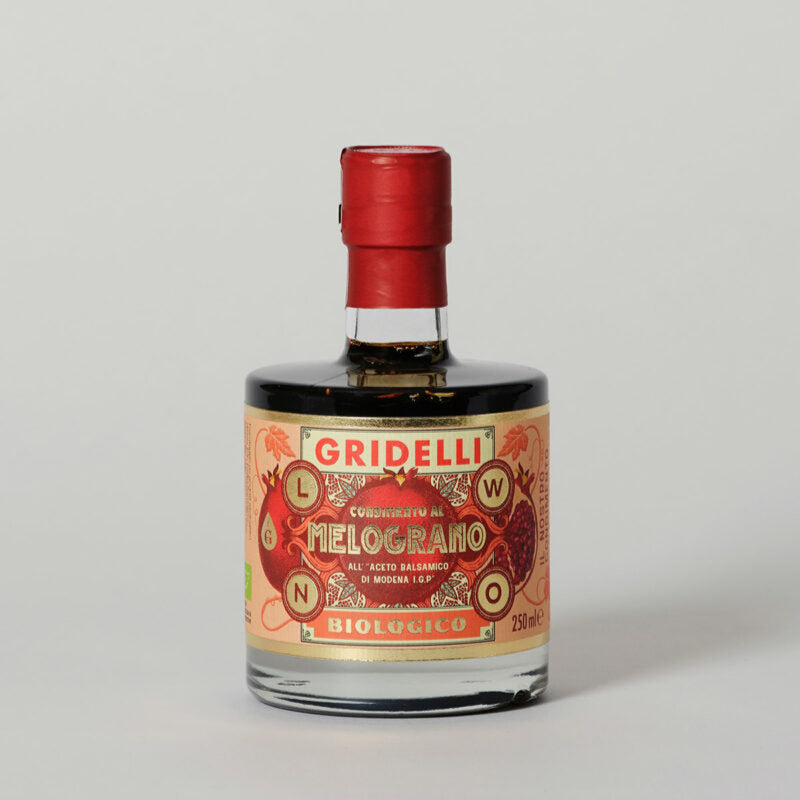Emilia-Romagnan luomurypäleostä valmistettu balsamico sisältää 95,8 % I.G.P.-sertifioitua Modenan balsamicoa, luomugranaattiomenamehua ja luonnollisia aromeja.Täydellinen yhdistettäväksi oliiviöljyn kanssa salaatissa, herkullinen ylellisenä yksityiskohtana juustolaudalla tai jälkiruokien täytteeksi.