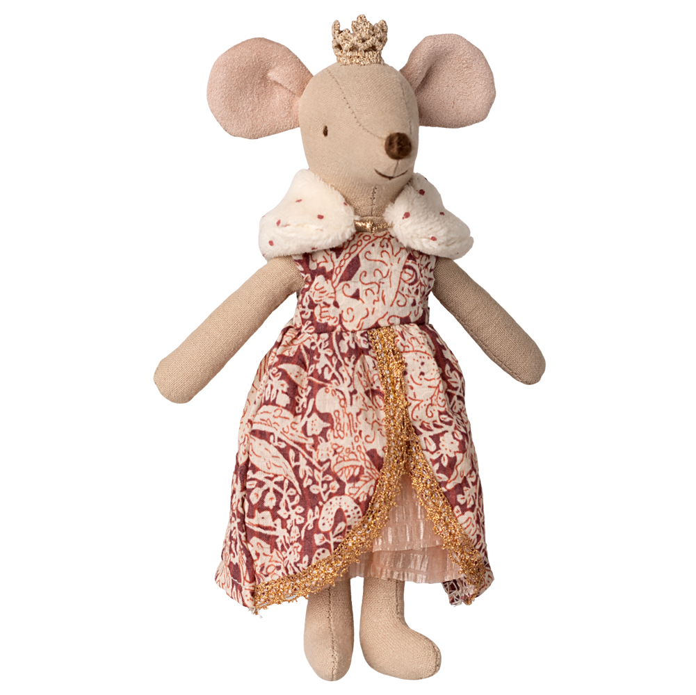 Oikea kuningatarhiiri äitihiirikoossa. Hän on pukeutunut upeaan leninkiin ja kultaiseen kruunuun. Hän sopii täydellisesti Mailegin linnaan.