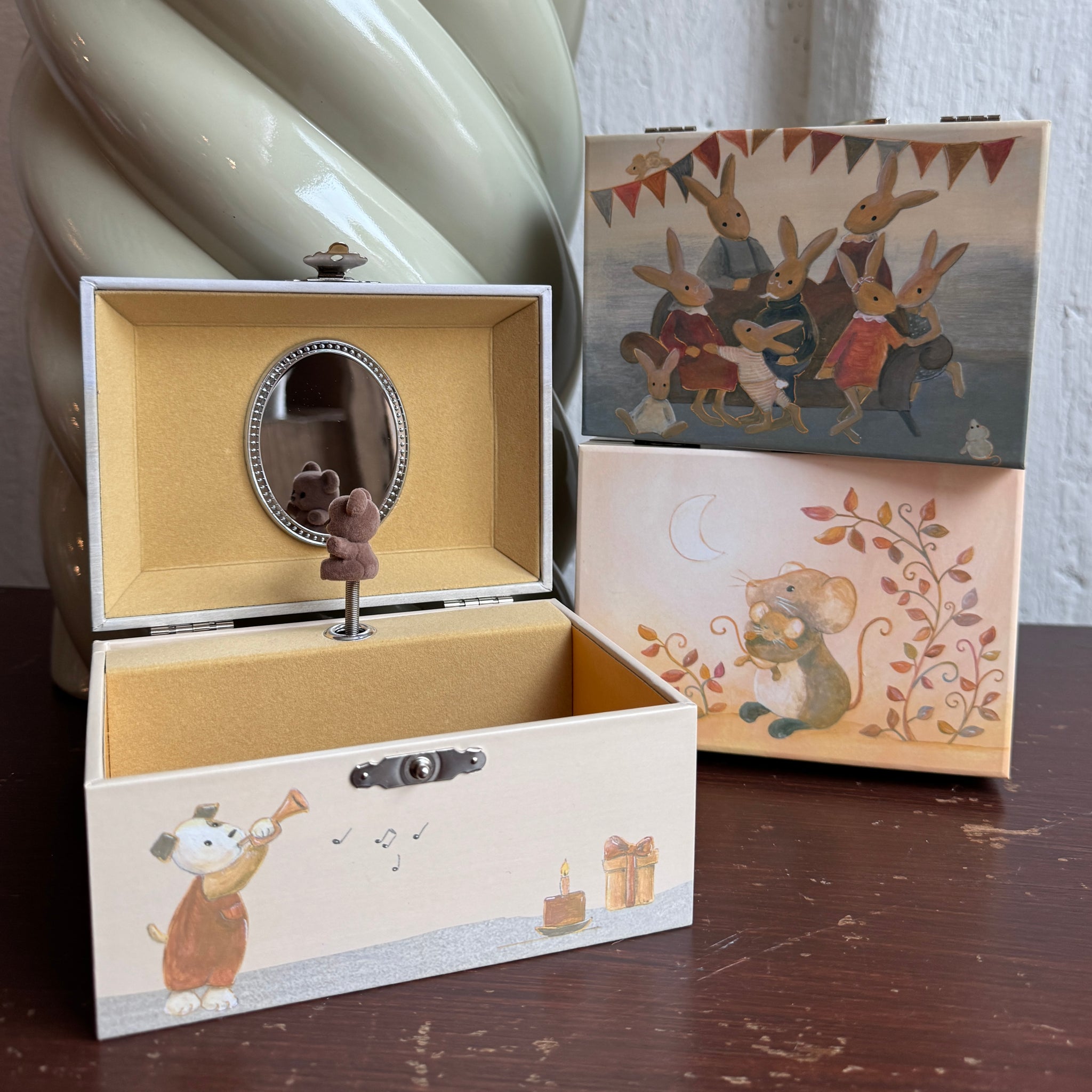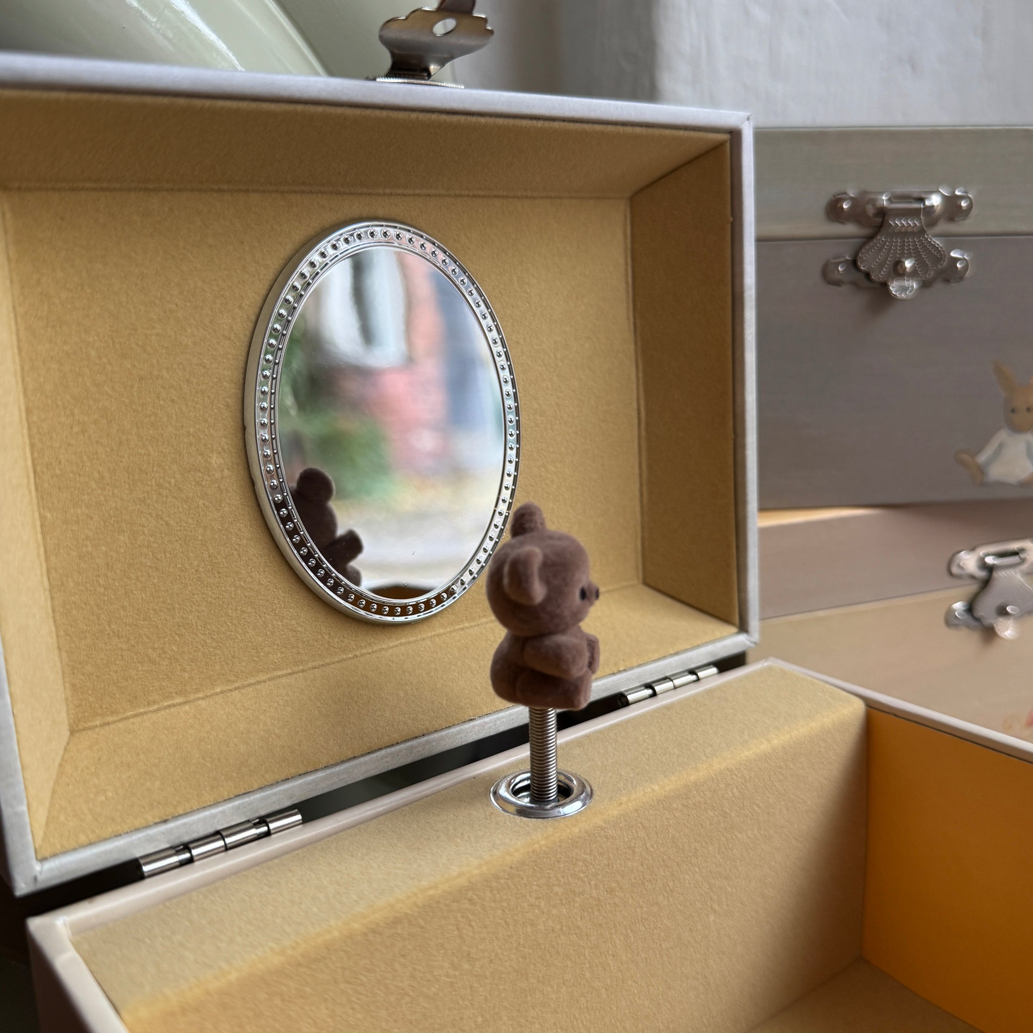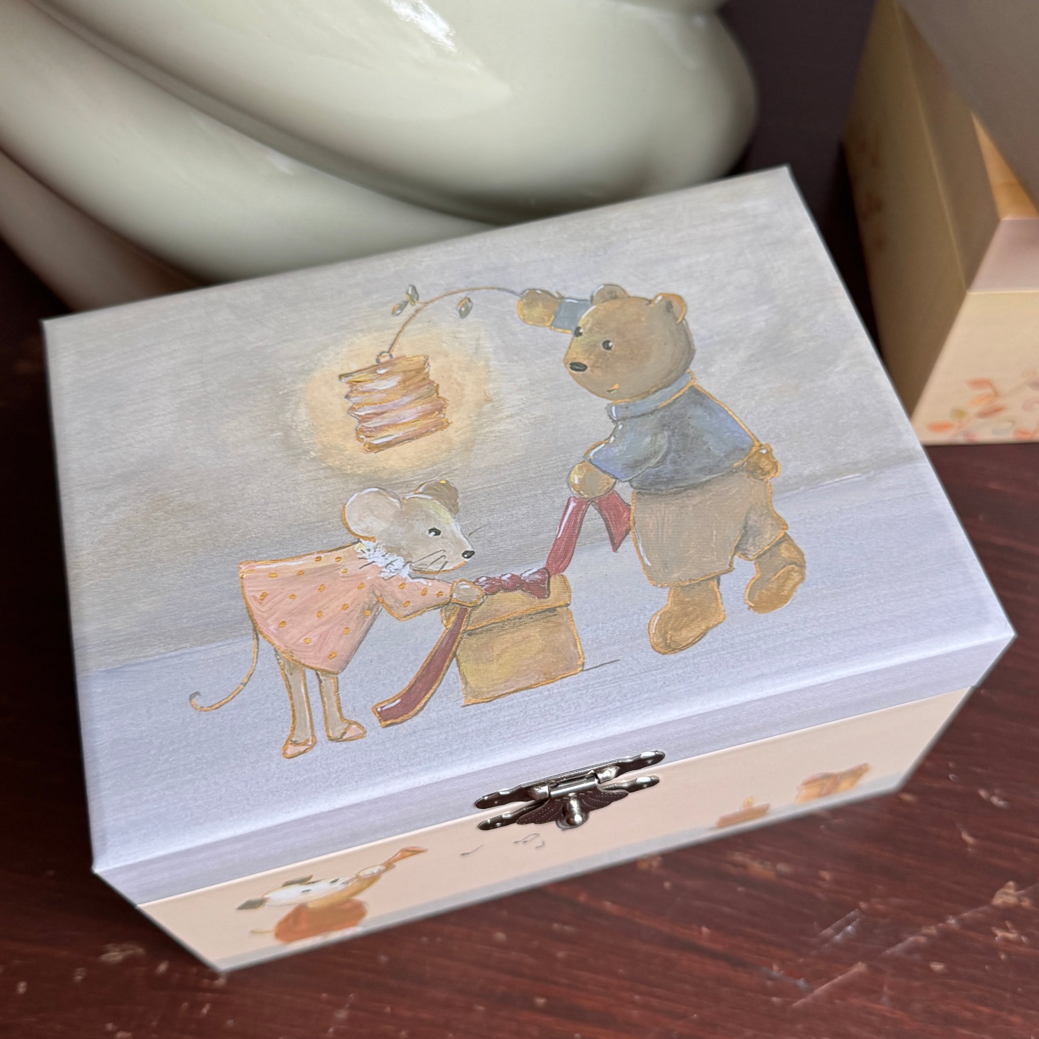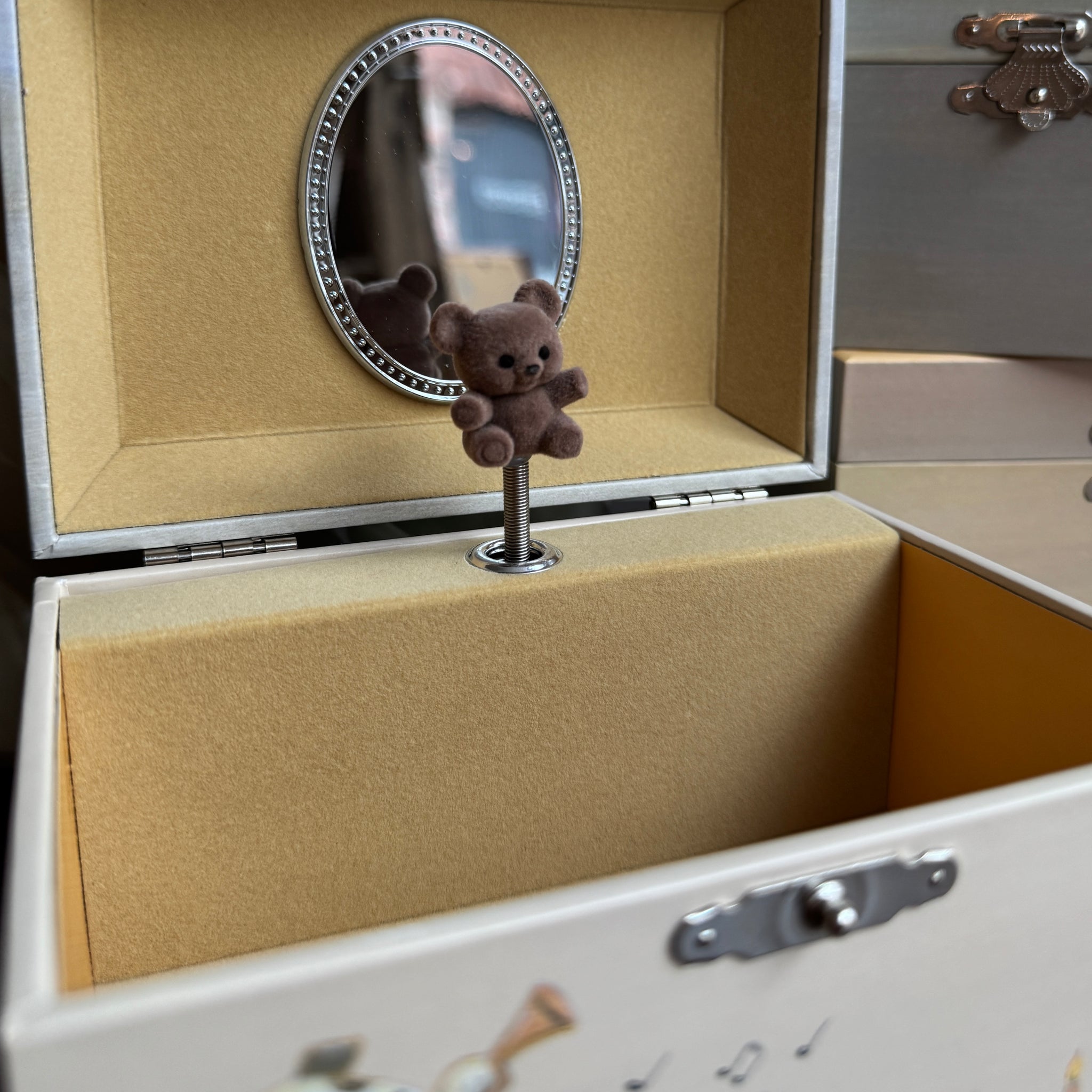 Ihana musiikki ja sen tahdissa pyörivä nalle. Tässä on ihana säilyttää pienet korut ja aarteet.