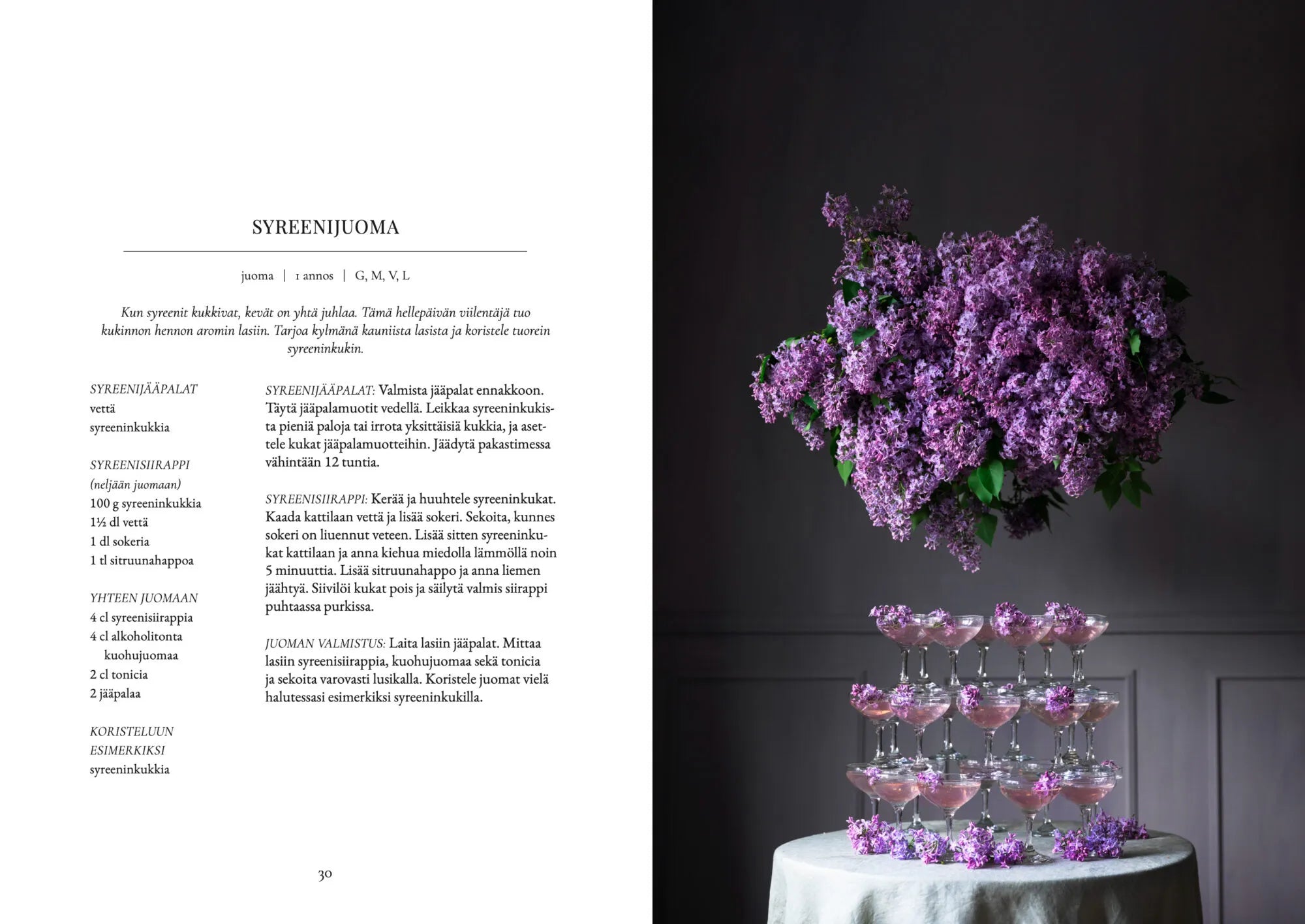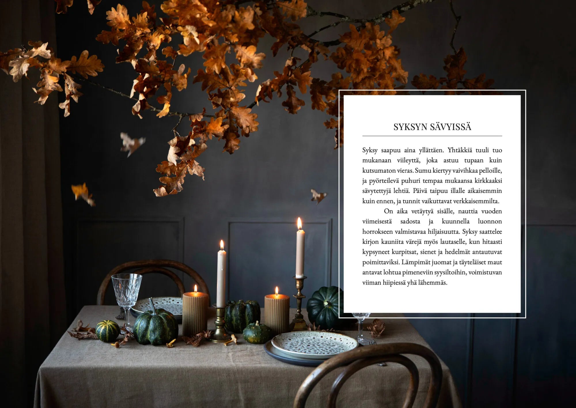 Neljän pohjoismaisen vuodenajan läpi kuljettava tarina on täynnä reseptejä, jotka ammentavat inspiraationsa kauden kauneimmista. Näiden kansien välissä pöydän antimet muistuttavat esimerkiksi kevään kukkaloistosta, kesän kypsyttämistä marjoista, syksyisen sienimetsän putoavista lehdistä tai talven lumisesta hohdosta.