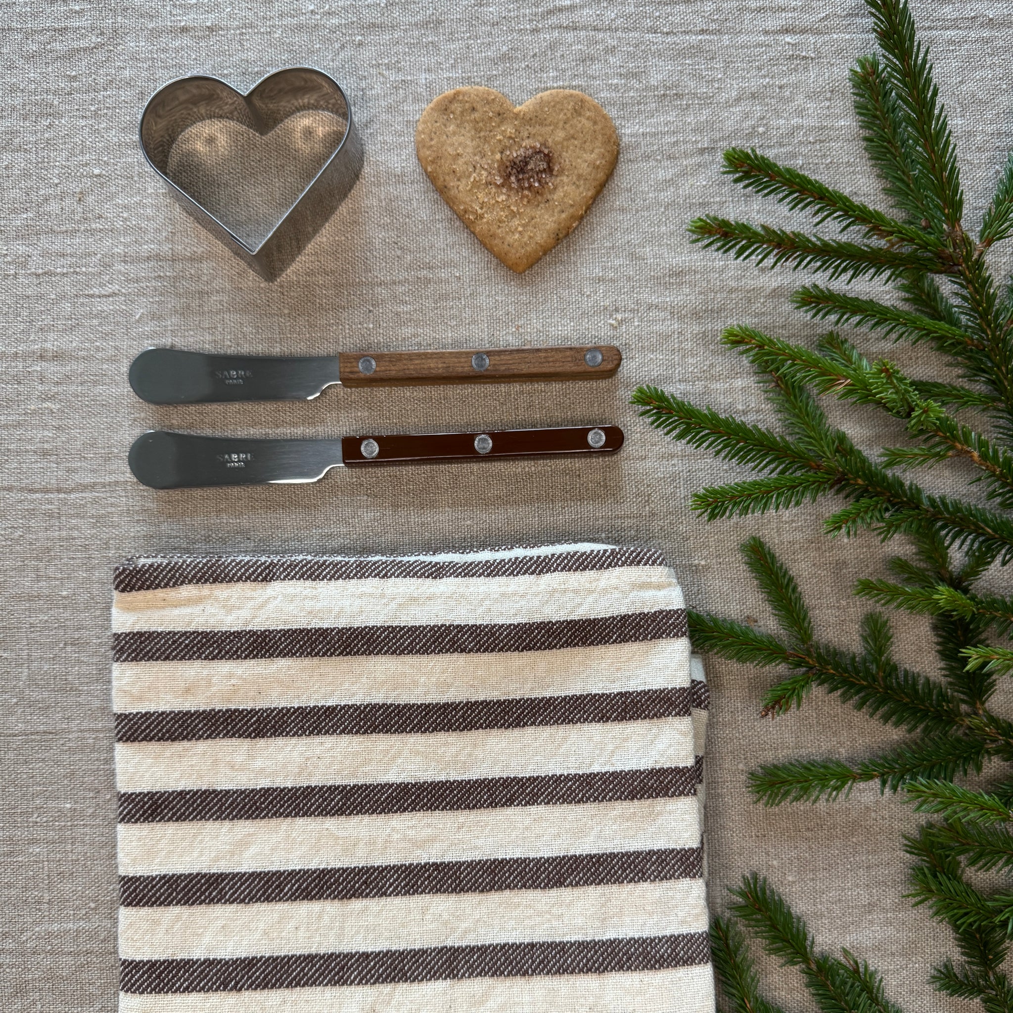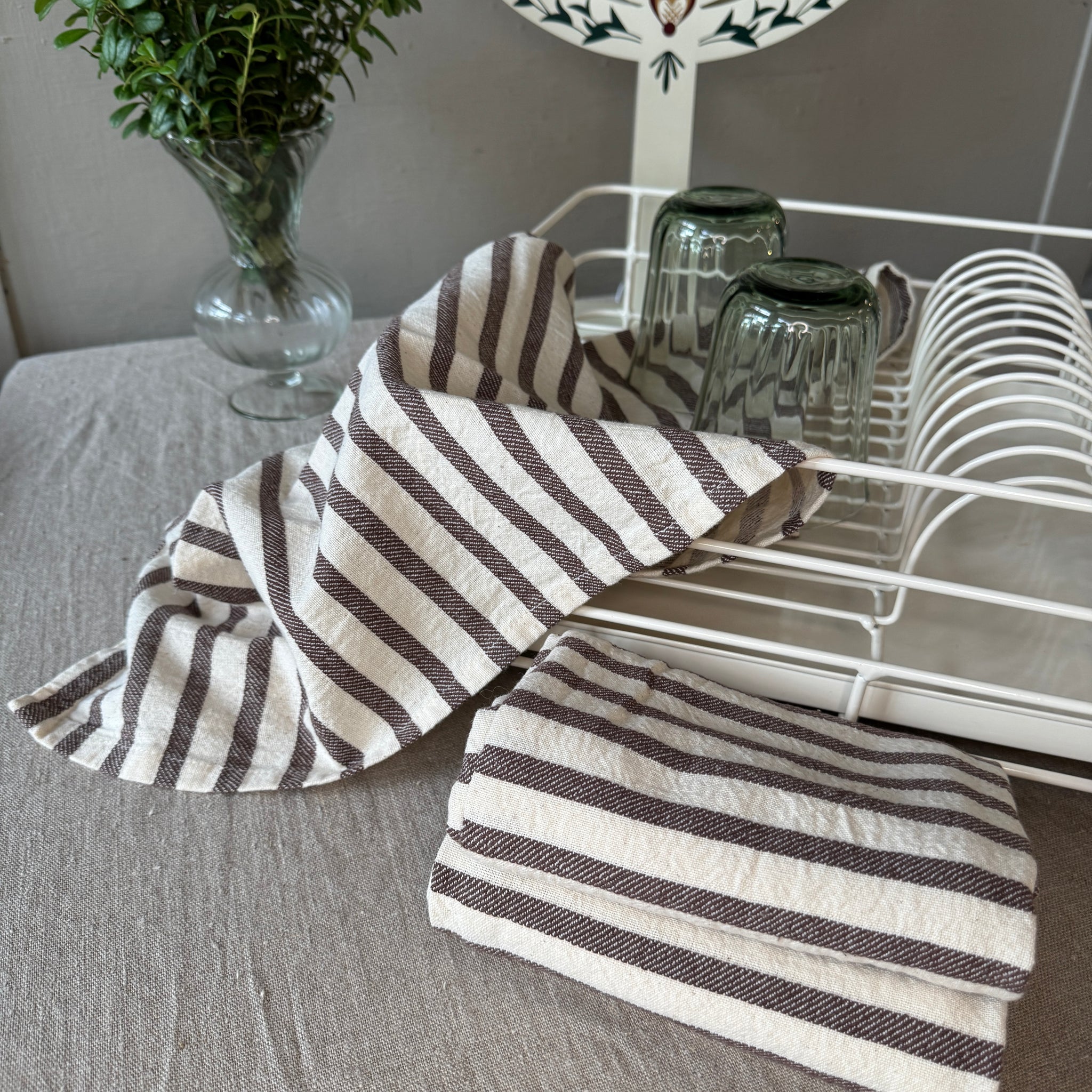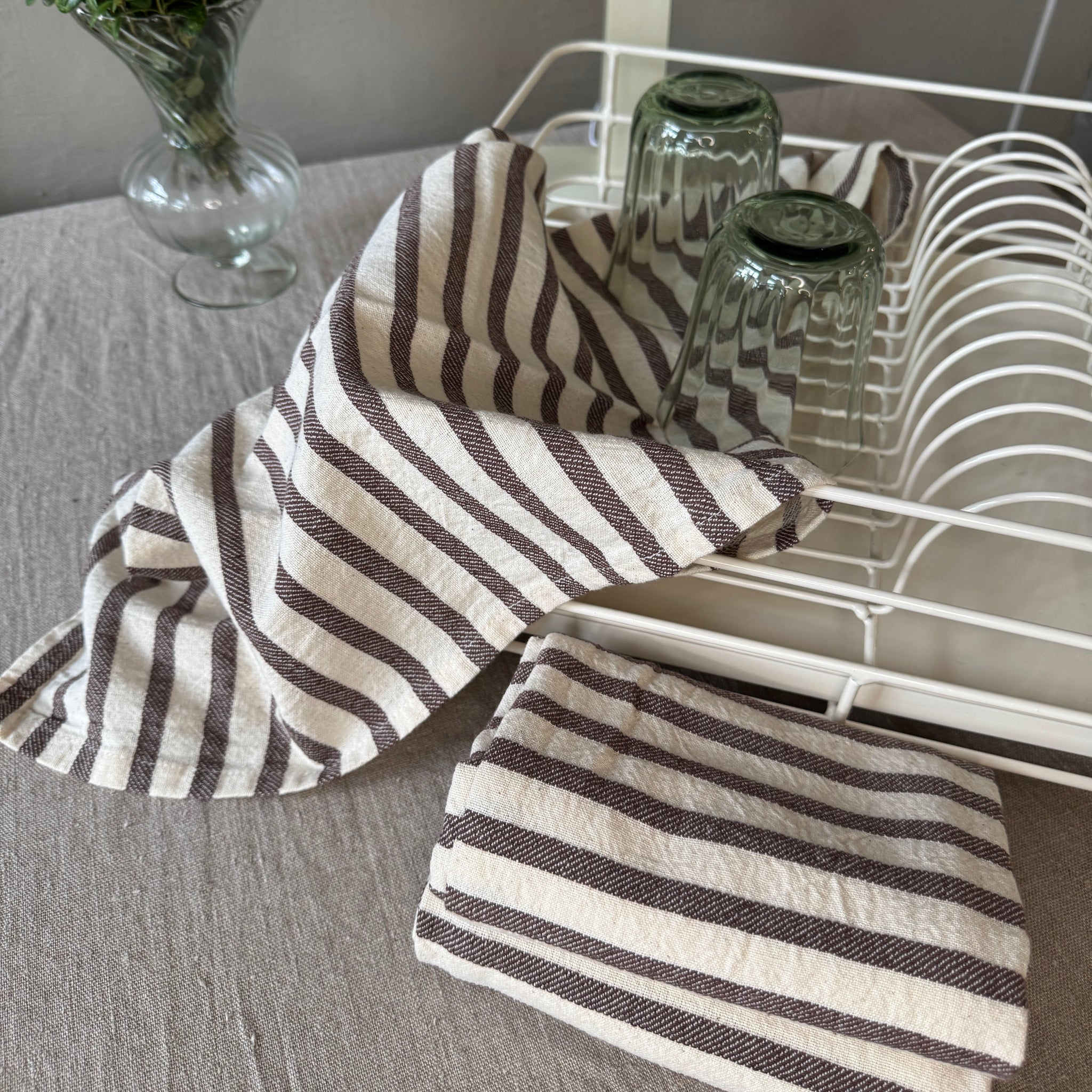 Vaakaraitainen keittiöpyyhe. Kangas luonnonvaalea ja raidat ruskeat.