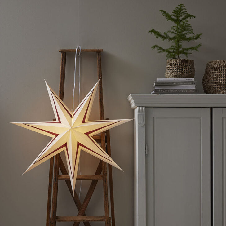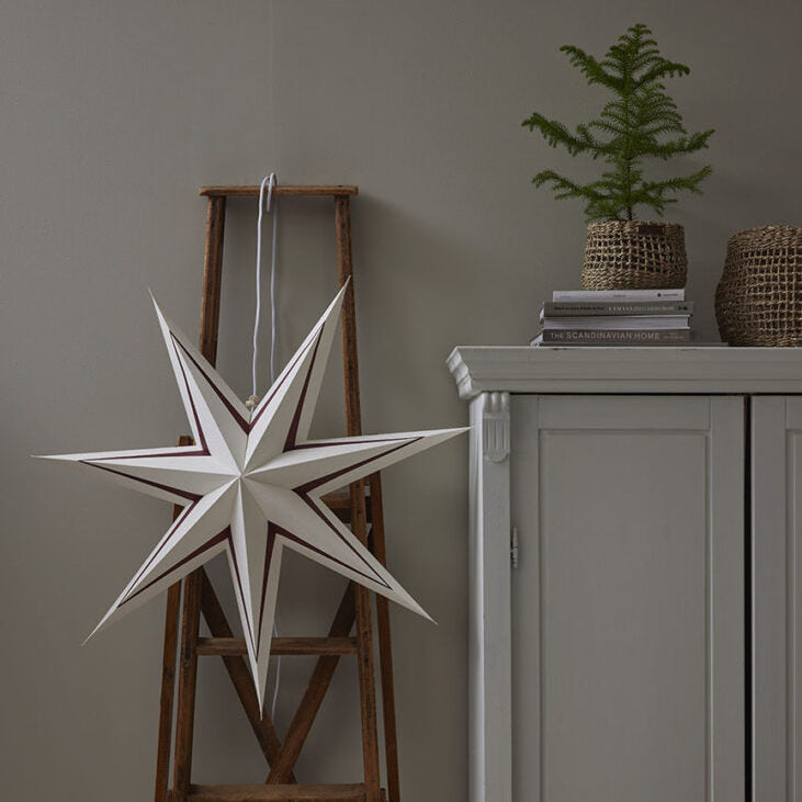 Klassinen valkoinen tähti kauniilla tummanpunaisella raidalla. Ripusta tähti ikkunaan tai seinää vasten tuomaan ihanaa joulutunnelmaa.